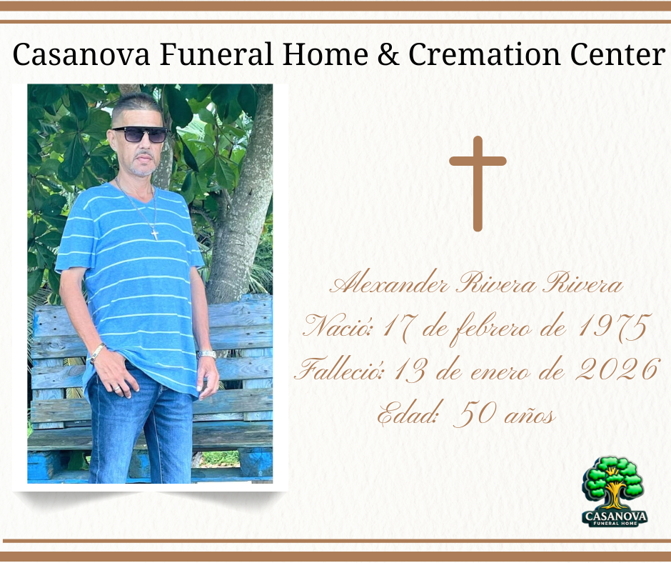 Alexander Rivera Rivera Nació: 17 de febrero de 1975 Falleció: 13 de enero de 2026 Edad: 50 años Sus restos serán cremados. NO estará expuesto en la Funeraria. Compartir
