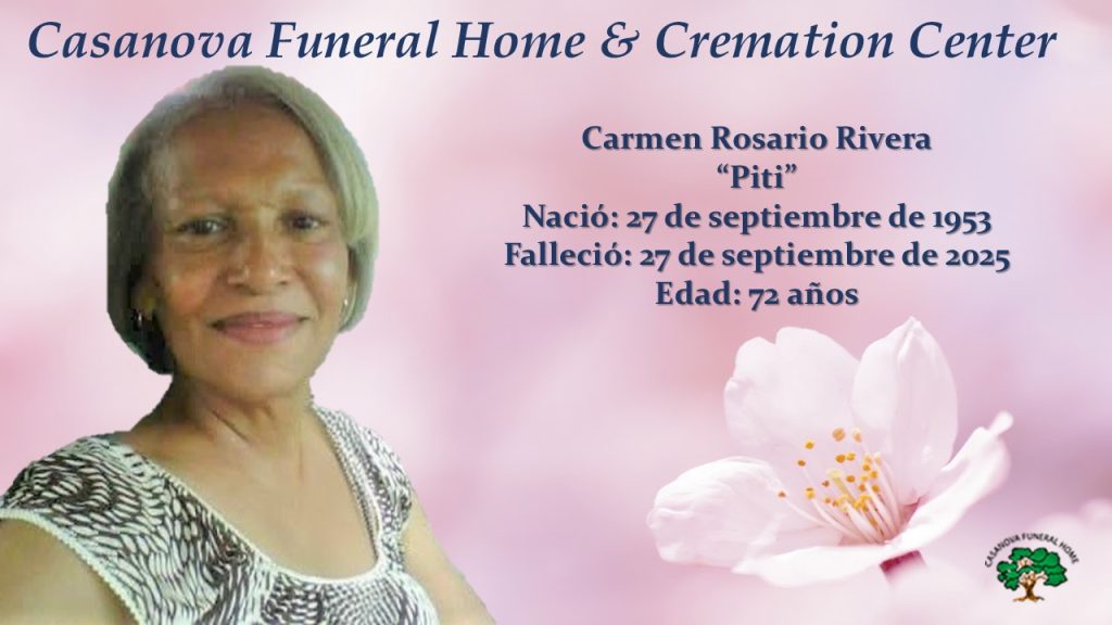 Carmen Rosario Rivera “Piti” septiembre 28, 2025 Casanova Funeral Obituarios No comments yet Nació: 27 de septiembre de 1953 Falleció: 27 de septiembre de 2025 Edad: 72 años Velatorio: 29 de septiembre de […] Leer más