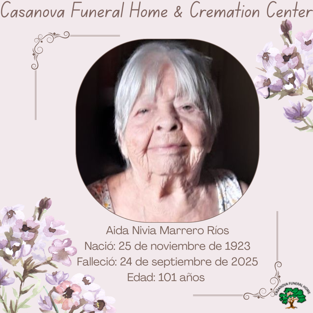 Aida Nivia Marrero Ríos septiembre 25, 2025 Casanova Funeral Obituarios No comments yet Nació: 25 de noviembre de 1923 Falleció: 24 de septiembre de 2025 Edad: 101 años Sus restos serán cremados. No […] Leer más