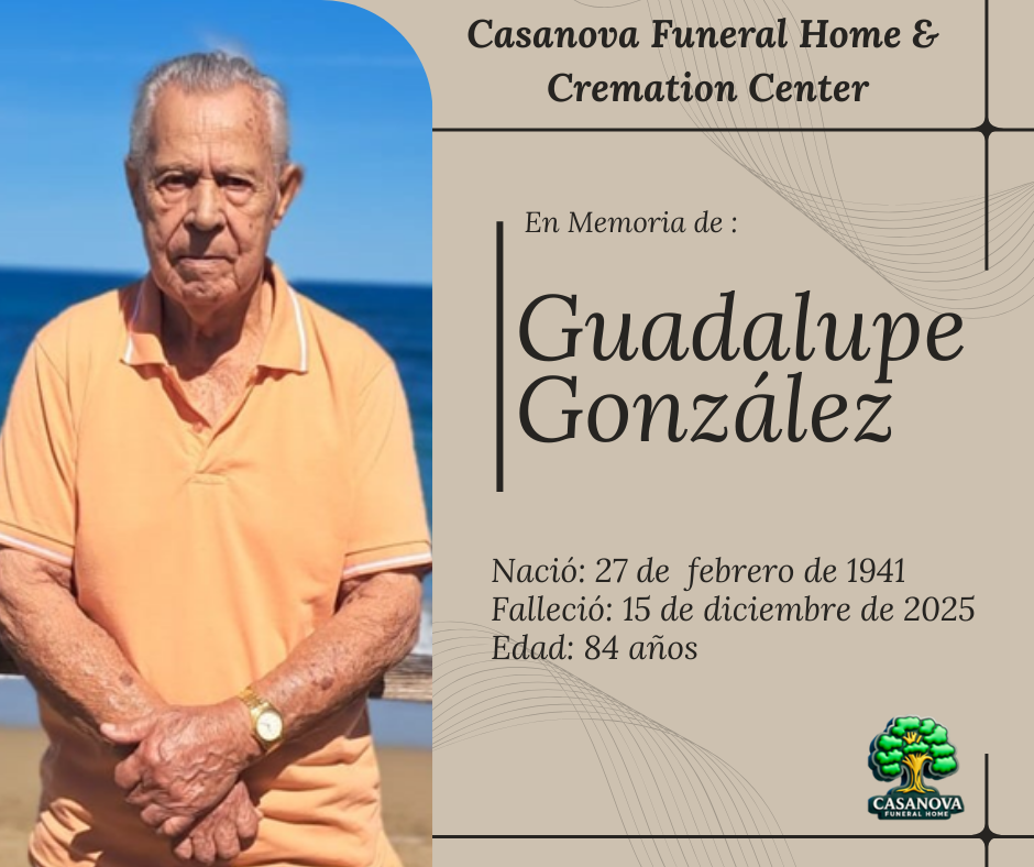 Guadalupe González González «Lupe» Nació: 27 de febrero de 1941 Falleció: 15 de diciembre de 2025 Edad: 84 años Velatorio: 18 de diciembre de 2025 Hora: 3:00 pm a 8:00 pm Luego del velatorio sus restos serán cremados. Compartir
