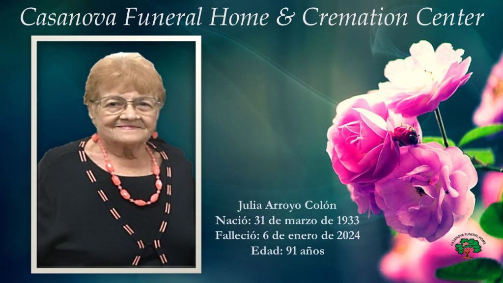 Julia Arroyo Colón Julia Arroyo Colón Nació: 31 de marzo de 1933 Falleció: 6 de enero de 2024 Edad: 91 años Sus restos serán cremados. No estará expuesta en la Funeraria. Compartir