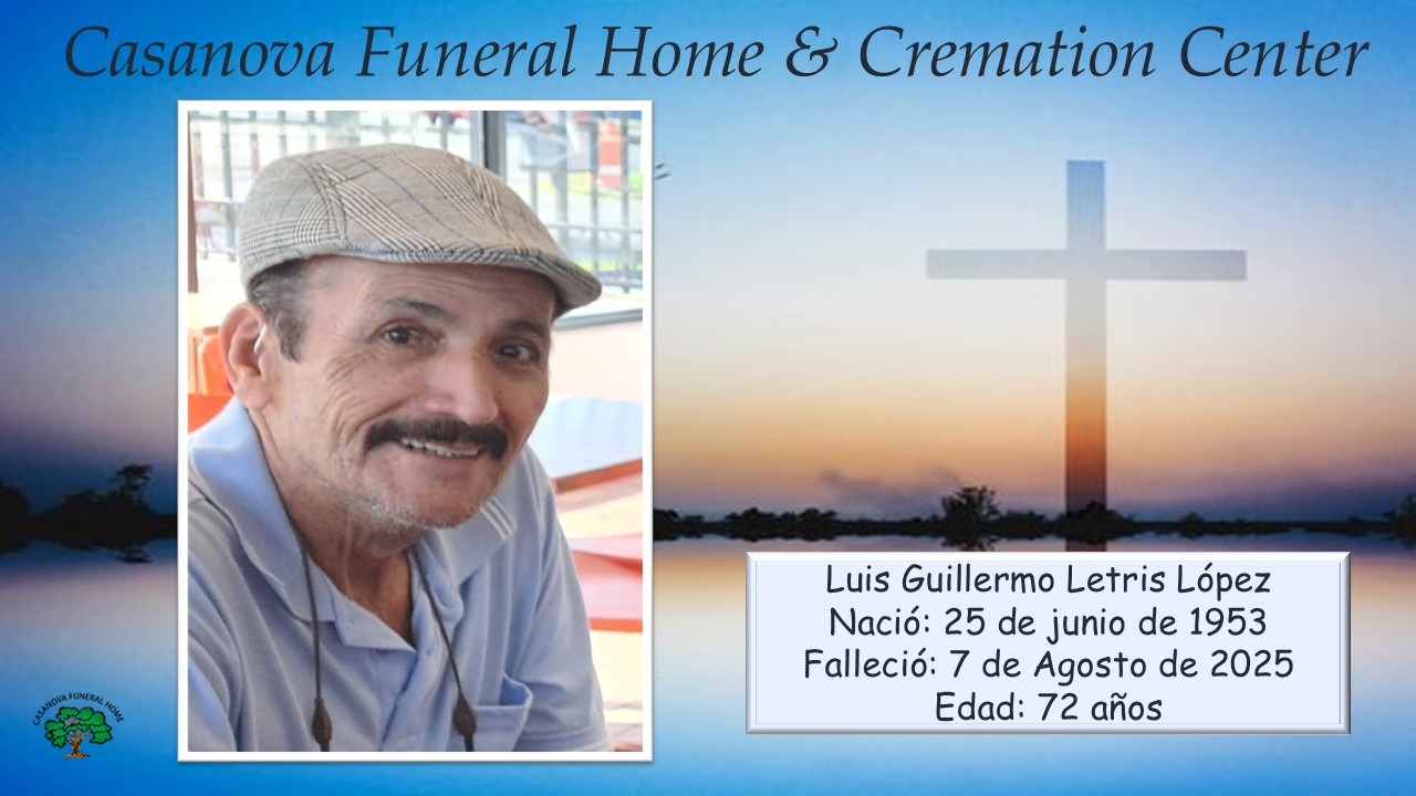 Luis Guillermo Letris López Nació: 25 de junio de 1953 Falleció: 7 de agosto de 2025 Edad: 72 años Sus restos serán cremados. No estará expuesto en la Funeraria. Compartir
