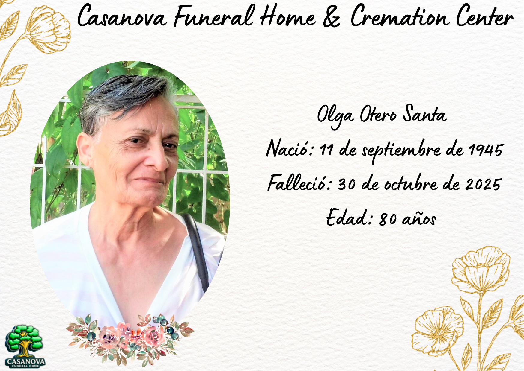 Olga Otero Santa Nació: 11 de septiembre de 1945 Falleció: 30 de octubre de 2025 Edad: 80 años Sus restos serán cremados. NO estará expuesta en la Funeraria. Compartir