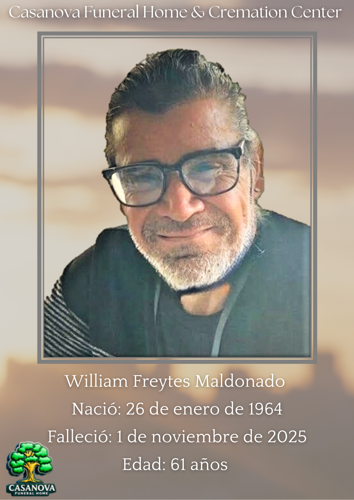 William Freytes Maldonado «Walo» Nació: 26 de enero de 1964 Falleció: 1 de noviembre de 2025 Edad: 61 años Velatorio: 6 de noviembre de 2025 Hora: 1:00 pm a 6:00 pm Luego del velatorio sus restos serán cremados. Compartir