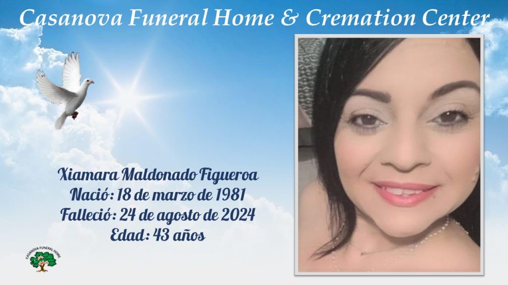 Xiamara Maldonado Figueroa Xiamara Maldonado Figueroa Nació: 18 de marzo de 1981 Falleció: 23 de agosto de 2024 Edad: 43 años Sus restos serán cremados. NO estará expuesta en capilla. Compartir